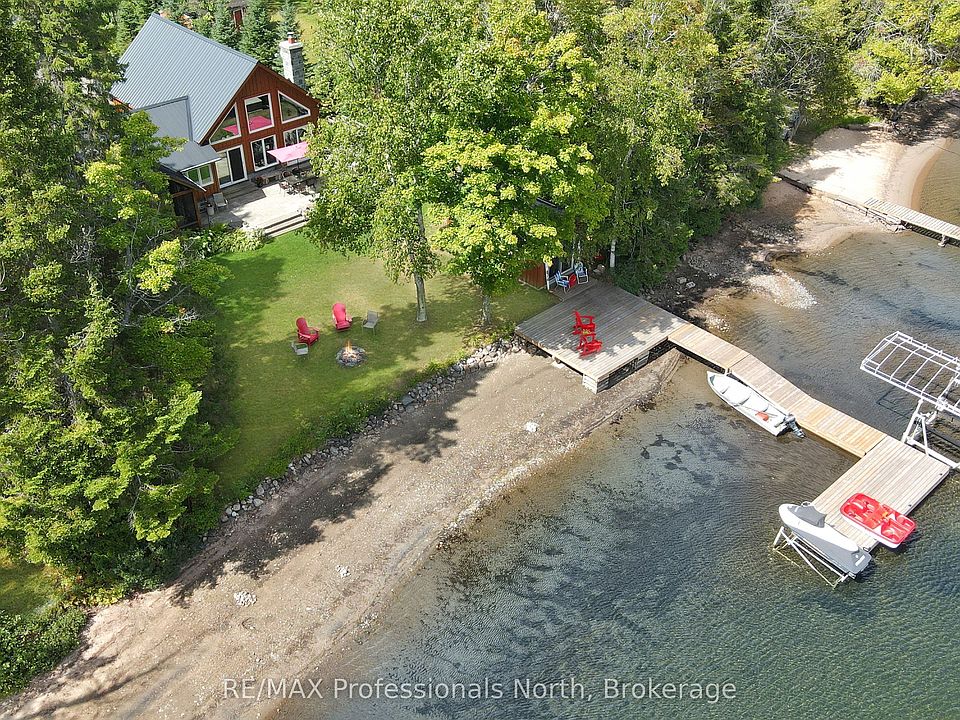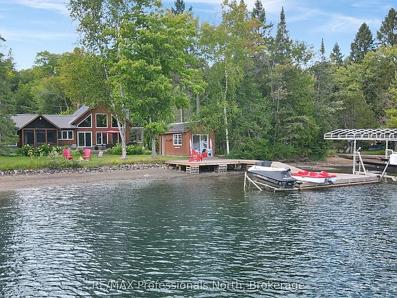 Discover your own slice of paradise at this exceptional lakefront property on Twelve Mile Lake- part of a 3 lake chain offering miles of boating. This 3-bedroom, 3-bathroom home offers the perfect blend of charm and modern comfort, making it an ideal year-round residence or cottage getaway. The heart of this home showcases an open-concept design seamlessly connecting the kitchen, dining room, and living room. Post and beam construction in the living room creates an impressive architectural statement, while the gorgeous stone fireplace serves as a stunning focal point in the living room, perfect for cozy evenings by the fire. The thoughtfully designed layout includes three comfortable bedrooms and three full bathrooms, with the primary bedroom featuring a luxurious ensuite bathroom complete with heated tile flooring for ultimate comfort. An additional loft space provides versatile options for guests, office space, or recreational activities. One of the home's most captivating features is the screened-in sunroom, offering breathtaking views of Twelve Mile Lake. The property boasts impressive outdoor facilities including a substantial heated workshop equipped with in-floor radiant heating, combined with a spacious 2-car garage that provides ample storage and additional workspace. The beautifully maintained, level lot gently slopes toward the water, leading to an exceptional sandy waterfront that's perfect for swimming, sunbathing, and water activities. The property includes a charming bunkie positioned near the water's edge, offering additional sleeping quarters for guests or a peaceful retreat for relaxation, while the natural sand beach provides easy water access and creates the perfect setting for family gatherings, entertaining, or simply enjoying the tranquil lake lifestyle.This property combines luxury living with the serenity of lakefront life, offering an opportunity to own a piece of Twelve Mile Lake's coveted shoreline.