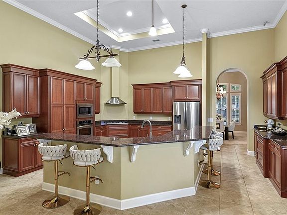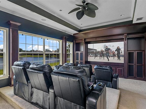 Experience the Florida lifestyle in this stunning FULLY FURNISHED 5-Bed/4-Bath pool home on over 1/2-acre, with a welcoming open floor plan spanning 4,500 square feet, spectacular Theater Room, custom upgrades and designer accents throughout, and new AC system in August 2025. Situated across from the community park and tennis on one of the best waterfront lots in sought-after gated Tildens Grove, offering a perfect blend of privacy and serene panoramic views. Step into elegance in the light and bright formal Living Room enhanced by a stunning Fireplace, Pool and Lanai views, and high Coffered Ceiling. The equally exquisite Formal Dining Room is also adorned with a Coffered Ceiling and ample natural lighting. A beautiful open Island Kitchen at the center of this home, perfectly situated for accommodating and entertaining friends and family, boasts Granite Counters, built-in Wall Oven and microwave, granite back splash, abundant storage in 42" wood cabinetry with pull outs, 5 burner Gas Stove and high-end stainless appliances, built-in cabinet Pantry. The Kitchen opens to the Dinette area with large picture window overlooking the Lanai and Pool, and Family Room ideal for entertaining with Built-Ins, storage and gorgeous details with French Doors leading to the outdoor living space. Relax, play, or entertain outdoors in the voluminous Pool with Spa and expansive covered Lanai, providing shaded space perfect for enjoying refreshments as you gaze across the water. The spacious Owner’s Suite is a true retreat tucked away on one side of the home, including an elegant bedroom with Sitting Area, stately entertainment wall unit, Double-Tray Ceiling, handsome wood flooring, French Door access to Lanai, and a generous walk-in California Closet system with dressing space. The finely appointed, light-filled Ensuite Bath boasts split sink vanities, large walk-through dual-head shower, Jetted Garden Tub, and private water closet. On the opposite end, the 2nd and 3rd bedrooms share a convenient Jack and Jill bathroom. The private 4th bedroom with Ensuite Bath is perfect for your visiting guests. The 5th bedroom adjacent to the Foyer is currently utilized as a den/home office. Enjoy a home cinema experience in the fabulous 6-seat Theater Room, equipped with great acoustical audio, large movie screen, leather recliner seating, gorgeous Custom Millwork with concealed column storage, all overlooking the Scenic Pond. Located in the hallway between the Kitchen and Dining Room are 2 extravagant built-in Mahogany glass-front cigar Humidors including Wine Storage to display and preserve cherished collections. High ceilings and Crown Molding accents throughout exude a sense of grandeur. French Doors from multiple rooms let you open the home to the outdoors space. Large, covered Lanai with a built-in grill, sink and counter space, screen enclosed Pool and heated Spa with a panoramic pond view. The neighborhood is quiet and private, with 140 luxury homes, in the top school districts, centrally located for convenience to Windermere's dining, shopping and culture, local theme parks, 429, I-4, and Florida's Turnpike. Whether you're entertaining or seeking a peaceful retreat, this home delivers on every level.