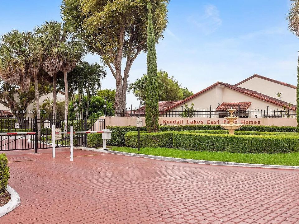 This charming corner cluster home offers 2 spacious bedrooms and 2 full baths in a secure, gated community. Enjoy a welcoming front courtyard that leads to the main entrance, plus a convenient storage room and a beautifully remodeled kitchen. The home features vaulted ceilings, accordion shutters throughout, and a 2017 roof for peace of mind. Outside, you’ll find a fenced backyard with a cozy terrace—perfect for relaxing or entertaining. Includes 3 private parking spaces and ample guest parking. Community amenities include a clubhouse and a sparkling pool.