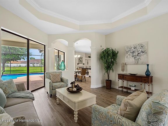 Nestled within the sought-after, gated community of Pristine Place, this stunning residence offers the perfect blend of elegance, comfort, and functionality. Featuring 4 spacious bedrooms (including two master suites), 3 full bathrooms, and a 3-car garage, this home was thoughtfully designed for modern living—and is fully wheelchair accessible for ultimate convenience. Major updates completed in 2022 include a new roof, A/C system, hot water heater, and pool equipment—ensuring long-term comfort and efficiency. Step inside and be immediately captivated by the panoramic pool views framed by 8-foot sliding glass doors. Every corner of this home reflects refined craftsmanship—luxury vinyl plank flooring, oversized baseboards, arched entryways, and tray ceilings create a timeless, elegant atmosphere.The chef-inspired kitchen is a true centerpiece, beautifully remodeled with white solid-wood cabinetry, granite countertops, tile backsplash, and a spacious island with breakfast bar. Stainless steel appliances and a new home warranty offer peace of mind, while the open layout seamlessly connects to the family room—complete with a custom fireplace mantle and more views of the sparkling pool.The primary master suite provides a serene retreat with private lanai access, vaulted ceilings, and dual closets, including a generous walk-in. Its spa-style ensuite features a garden tub, separate shower, and modern finishes. The second master suite is equally impressive, offering privacy for guests or extended family. A versatile flex room adds even more flexibility—perfect as a fifth bedroom, home office, gym, or playroom, depending on your lifestyle needs. Step outside to your private resort-style oasis—a sprawling screened lanai showcasing a sparkling pool with an integrated spa, a built-in outdoor grill, and lush landscaping that creates a tranquil escape for entertaining or unwinding. Welcome home to Pristine Place—where comfort, elegance, and accessibility come together beautifully.