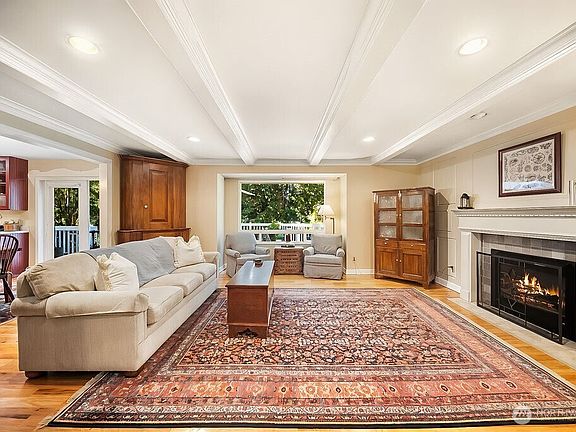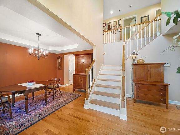Beautiful 4-bedroom, 3.5-bath home with bonus room and office in the sought-after Evergreen Ridge neighborhood! This elegant home features rich hardwood floors, custom built-ins, a grand staircase, and fireplaces on both levels. The spacious primary suite includes hardwood floors and a luxurious 5-piece bath. The finished basement offers a separate entrance, perfect for guests, multi-gen living, or extra entertaining space. French doors open to a large deck overlooking a private, landscaped yard that backs to the peaceful community greenbelt. Enjoy the amenities, including a 5-acre neighborhood park, miles of walking trails, and easy access to shopping, ferries, bases, and the freeway-all within the highly rated NK School District.