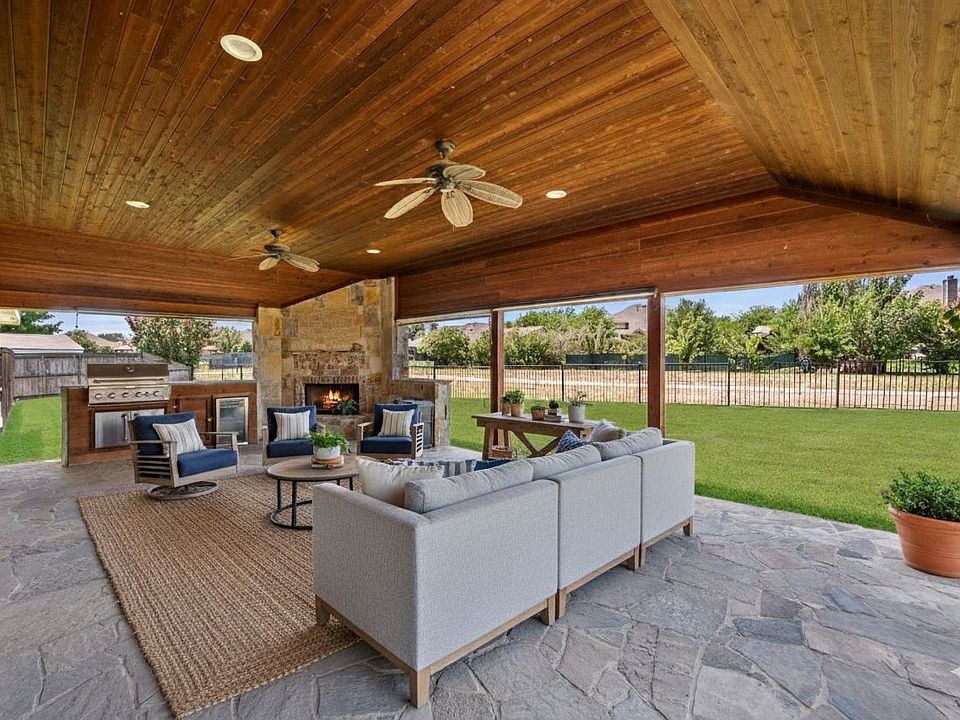 Indoor-outdoor living in Sendera Ranch with room to spread out. This flexible plan offers 4 bedrooms (or 3 + dedicated office), a separate dining room and an upstairs bonus room with a walk-in closet for exceptional storage. The kitchen features a gas range, generous prep space and a bright breakfast nook. The family room centers around the fireplace with a view to the backyard. The downstairs private suite includes dual sinks, separate tub shower and a walk-in closet. Out back, the covered flagstone patio is the show-stopper with cedar accents, built-in grill and prep station, and a wood-burning fireplace, all overlooking the greenbelt and walking trail beyond the fence. The wide (~172-ft) backyard adds usable space, with a gravel play area, oversized concrete pad and storage building. Situated on a bend for extra side yard. Sendera Ranch amenities include pools, splash pad, sport courts, trails and ponds with convenient access to shopping, dining and services. Northwest ISD. *Buyer to verify schools, taxes, measurements and HOA*