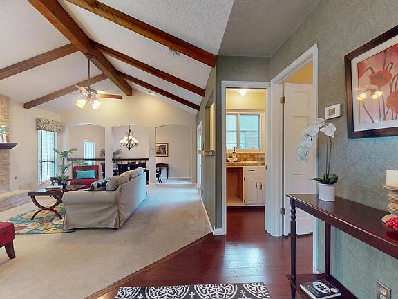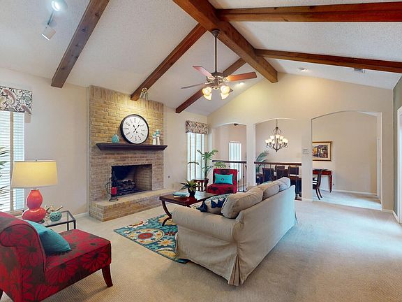 This well maintained single-story home features an open layout with impressive beamed high ceilings that create a bright spacious feel throughout. The brick fireplace has a gas starter, bar area with space for wine fridge. The neighborhood and home abound with mature trees, there's also a sprinkler system. All rooms face the huge 20'X30" deck, easy in and out for entertaining. The kitchen island is unfinished butcher block, stainless appliances and solid counters with under cabinet lighting. Updated primary bath has a huge tub and 2nd water heater to keep it toasty. Corner lot and circular drive offers plenty of parking for guests and a heavy duty carport for a car or trailer. Just minutes from airport, major highways, shopping and restaurants!