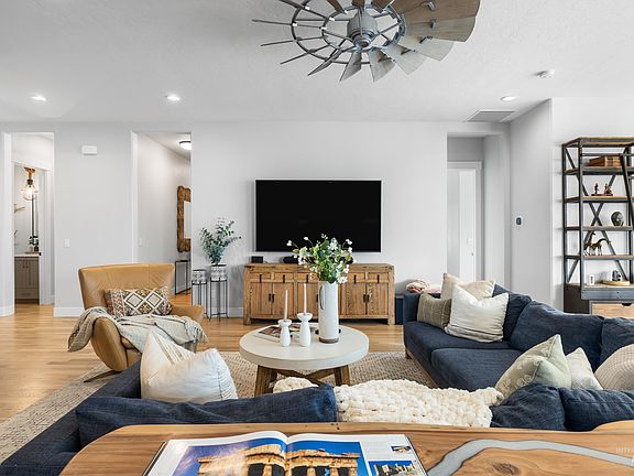 Incredible new opportunity in Dry Creek Ranch - this better-than-new single-level farmhouse has been freshly priced to sell. Situated on a 1/3 acre lot, the home offers 4 bedrooms including 2 suites and a Jack & Jill, 3.5 baths, an office, and a split-bedroom design ideal for guests or multi-gen living. The oversized 4-car tandem garage with epoxy floors provides rare storage and parking flexibility. Interior upgrades include hardwood floors, quartz counters, custom lighting, motorized blinds, and whole-home water treatment with humidifier, softener, and filtration system. The backyard features an extended patio and tiered hillside - perfect for gardening, entertaining or relaxation. Enjoy the unmatched resort lifestyle of Dry Creek Ranch with clubhouse, gym, coffee shop, community farm, two pools, parks, trails, and top-rated Eagle schools.