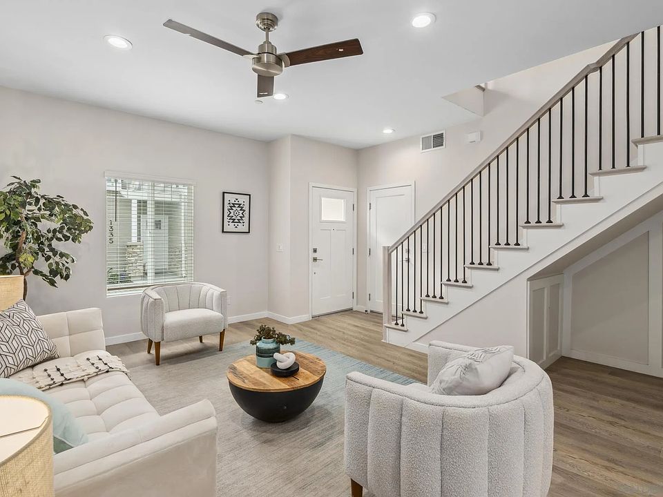 Second-floor tanning balconyContemporary flairEn-suite bathBreakfast barAbundance of natural lightCraftsman-style townhomeDesigner touches