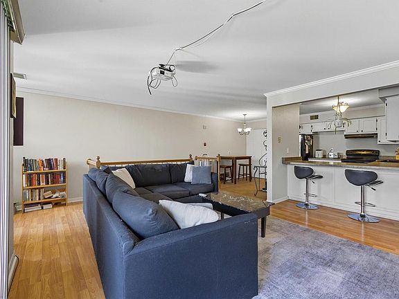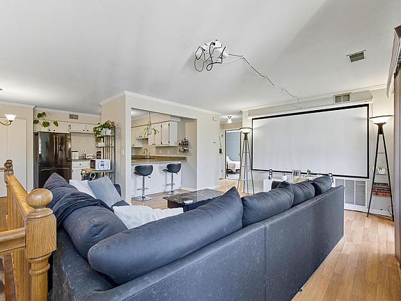 Beautifully updated 2nd floor condo with private entry. Interior updates thoughtfully curated by an interior designer and feature an open concept floor plan boasting fresh paint, crown molding, and a theater/living room setup with an included projector screen. 2 spacious bedrooms with closet systems, and updates throughout as well. Preferred location near the village park, shopping, restaurants and HWY I-94. Building and garage roof both replaced since 2020. 1 cat per unit allowed.
