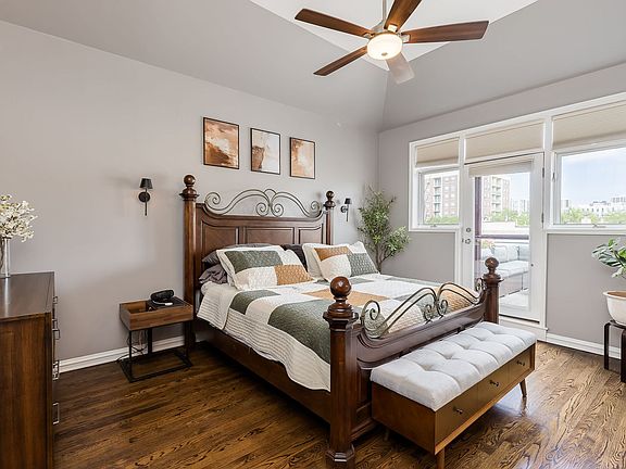 Experience luxury city living in this stunning 3-bedroom, 3-bath penthouse duplex with sweeping skyline views. A dramatic cathedral ceiling soars above the open living and dining area, while a wall of windows floods the space with natural light. Gleaming oak hardwood floors run throughout, leading to an open-concept kitchen with granite countertops, stainless steel appliances, a center island, and freshly resurfaced wood cabinets. The main level features two spacious bedrooms. One offers an en suite bath and access to a charming wood balcony. The second, currently used as an office, includes a custom built-in cabinet that conceals a hidden room-ideal for storage, a personal bar, or a butler's pantry. Upstairs, the private primary suite boasts an en suite bath with a double vanity and direct access to a Trex rooftop balcony-perfect for entertaining, taking in the skyline, or watching the sunrise over the lake. A family room overlooking the double-height living space enhances the open, airy feel. One garage parking space is included. Located in the heart of Old Town, this home offers easy access to vibrant Wells Street while feeling tucked away on a mature, tree-lined street. Enjoy boutique shops, coffee spots, restaurants, and nightlife just steps from your door, with the lakefront, Lincoln Park, and public transit close by.