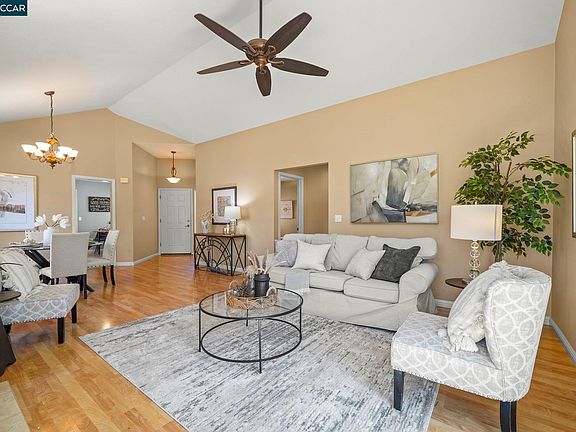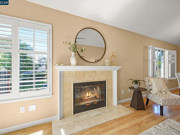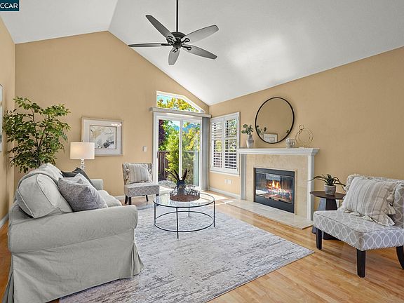 Rarely available updated single-story in Chaparral Springs at Oakhurst Country Club! This home offers an open floorplan with neutral decor. The gourmet kitchen features slab countertops with decorative tile backsplash, an abundance of updated cabinetry, newer stainless steel appliances, recessed lighting, and a casual dining area featuring built-in bench seating and a convenient built-in desk. A formal dining room and living room offer a cozy fireplace and slider to the backyard creating an inviting space for entertaining. The secondary bedroom features custom built-ins. The spacious primary suite boasts backyard access through a slider and offers an updated ensuite bath with dual vessel sinks and a shower-over-tub. The hall bath has also been tastefully updated with a modern vanity and stall shower with a solid surround. Enjoy a private backyard retreat with paver patio, perfect for relaxing or entertaining. 2 car attached garage. With its prime location located near the community pool and just moments from charming downtown Clayton with shopping, dining, transportation and scenic walking trails this home has it all. Must see!