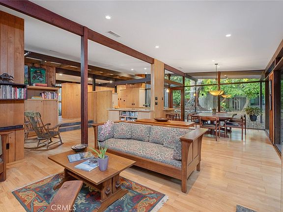This extraordinary residence is a Mid-Century Modern post-and-beam masterpiece, designed by Everett Tozier & reimagined by Hartman Baldwin with uncompromising attention to detail. A sprawling front yard enveloped by lush, curated landscaping creates a private sanctuary & sets the tone for the home’s refined elegance. The striking custom pivot door made of walnut & ash-olive wood offers a grand welcome, revealing interiors where dark slate tile flows into warm white oak floors, a pairing that harmonizes beautifully with the home’s architecture. A dramatic floor-to-ceiling wall of glass floods the open living & dining rooms with natural light, framing verdant views while highlighting the granite fireplace’s bold textures. The dining room flows effortlessly into a showpiece kitchen designed for both culinary artistry & social connection. Crafted with custom birch cabinetry, the space pairs sleek stone countertops with a sophisticated backsplash for visual depth. High end appliances, including a built-in refrigerator, offer both beauty & function, while the layout invites effortless entertaining with open sightlines to the living & dining rooms. Exposed beams & fine finishes stay true to its post-and-beam heritage, creating a space that feels both timeless & modern. Three spacious bedrooms & two exquisite bathrooms include a primary suite transformed into a true retreat, complete with a sitting room featuring built-in bookcases, a pocket door for privacy & serene backyard views. This en suite is a luxurious escape with a granite slab shower, custom vanity & expansive walk-in closet. Dual outdoor access connects the primary to both the backyard & the poolside patio. While the main house offers 2,154 SF, the guest house at 420 SF, seamlessly integrates with the carport, offering its own open layout with a kitchenette, living room, bedroom & bathroom, perfect for extended stays or private hosting. Expansive & beautifully designed, the backyard offers multiple lounging & dining areas framed by mature trees & manicured greenery. From shaded retreats to open sunlit spaces, it provides the perfect setting for both serene relaxation & lively gatherings. A shimmering pool sits beside the primary suite, creating a resort-like ambiance & a stunning focal point for the outdoor living experience. A property of rare architectural significance & thoughtful craftsmanship, this home delivers an unparalleled lifestyle where design, comfort & privacy converge in perfect harmony.