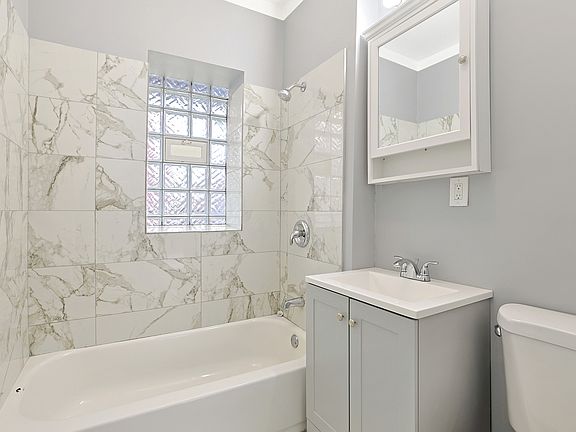 The renovated bathroom features a stylish, functional layout that makes your daily routine feel refreshed.