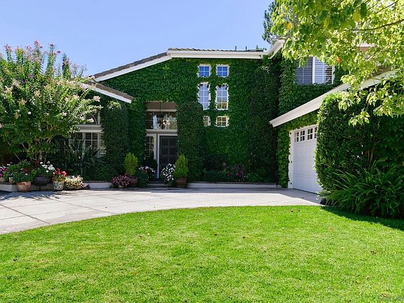 Step into a world of timeless elegance and masterful craftsmanship in this immaculate Poway Oasis. This home is a true work of art, meticulously designed for the discerning homeowner. The exterior enchants with flourishing Boston ivy, evoking the classic charm of a New England estate. Inside, an elegant floor plan flows seamlessly from one captivating space to the next, each revealing custom details and high-end finishes. A carved mahogany front door welcomes you into a grand two-story foyer featuring a custom staircase with wrought-iron balusters and wainscoting. As you move through the living room, you'll discover an intimate retreat with a quaint wood-burning stove and equipped with a Bose surround sound for a truly immersive experience. French doors lead out to reveal the incredible backyard oasis, a shimmering pool and spa are surrounded by a patio paved with classic brick pavers and lush, meticulously maintained landscaping. A covered lounge area provides the perfect setting for relaxation. In the kitchen, you’ll find a stunning black apron sink and contrasting black leather granite countertops, perfectly set against crisp white cabinetry and a mosaic stone backsplash, while plantation shutters allow for natural light to flood the room. The upper level is dedicated to rest and rejuvenation, featuring four well-appointed bedrooms. The primary suite is a true sanctuary, and a unique feature of this home is the second bedroom's ensuite bath, providing the versatility of a junior primary suite. This home is more than a residence; it’s an experience of sophistication.