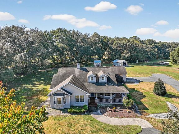 One or more photo(s) has been virtually staged. Nestled on 9.08 acres of beautiful, natural Florida land, this charming 4-bedroom, 2.5-bathroom home offers the perfect blend of country living and modern convenience. The barn, measuring 21 by 20 feet, boasts a solid concrete floor that provides a sturdy foundation for storing tools and equipment with lots of spacious room. With plenty of space for your horses, chickens, and dogs, this property is an animal lover's dream. The home is surrounded by mature oak trees creating a serene and private retreat. A dog pin, and a chicken coop are conveniently located in the back, providing all the space you need for your pets and equipment. The screened-in, 6-foot-deep pool, offers potential for refreshing swims. Inside, you'll find a spacious living room with wood flooring, complete with a cozy wood-burning fireplace—perfect for relaxing evenings. The master bedroom features a walk-in closet and French doors that open to the pool area, creating a peaceful and private escape. The kitchen is equipped with a breakfast nook, bar, and countertops, and flows seamlessly into the dining room, where large bay windows provide beautiful natural light. Wood floors continue into the kitchen and dining areas, adding warmth and character throughout the home. Most of the bedrooms are carpeted, except for one which is tiled, and there are two full bathrooms plus a convenient half bathroom. Additional amenities include detached two car garage, a brick back porch, and a welcoming front porch. The home also boasts a dedicated laundry room and a unique layout with the garage situated across a covered, screened-in walkway from the house. The fence on the northern side of the property is not on the property line. The driveway does have to be moved. Located just minutes from Oxford and The Villages, the property provides many options for dining and shopping. Downtown Wildwood is about a twelve-minute drive south, as well as convenient access to US Hwy 301 and the Florida Turnpike, this home combines peaceful rural living with easy access to all the amenities you need. The pool has been staged as the the pool has been drained due to cleaning.