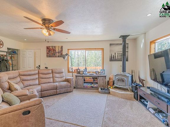 This charming 3 bed 2 bath is a must see with master bedroom suite! As you walk in you will be greeted with open concept living room into the updated kitchen. Relax during the cold winters with the modern fire place and the natural light that beams in during the summers. Relax with friends and family on the private deck that is surrounded by trees that gives you the Alaskan feel on your one acre lot. Book a showing today!