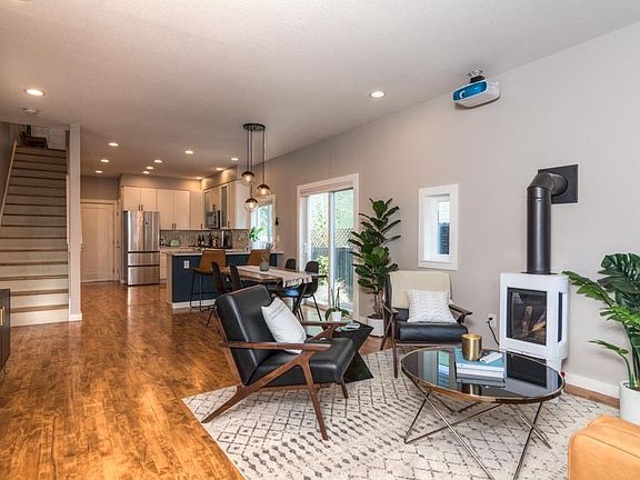 This light and bright two story home has all of the living space on the ground floor including a large front porch and idyllic outdoor living space on the side of the house. Inside the front door is the living room with a gas fireplace, Maple floors from front to back and a 4k UHD projector that translates to a 90" screen on the wall. Moving into the well lit kitchen you will find a modern touch of cabinetry and stainless steel appliances. There is also a half bath on the main level.