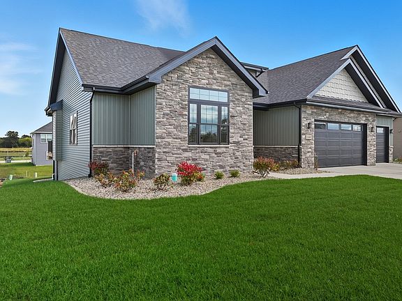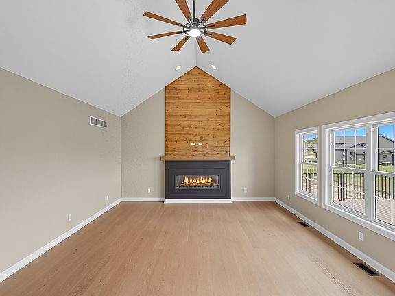 Step into this thoughtfully designed new-construction ranch, where quality and style are evident in every detail. Spanning 1,890 sq. ft, the home features engineered hardwood flooring throughout, a soaring two-story foyer with chandelier, and a bright great room with cathedral ceiling, anchored by an electric fireplace with a wood mantle. Large Andersen windows with black exterior trim fill each room with natural light. The kitchen is outfitted with a GE Slate appliance package, quartz countertops, soft-close cabinetry, and countertop seating that opens to the great room-ideal for everyday living or entertaining. You'll appreciate the convenience of a pantry cupboard with pull-out shelves, under cabinet lighting, and large workstation sink. The breakfast room leads out through sliding glass doors to the oversized composite deck. Ceiling fans throughout enhance comfort, while solid-core doors and oak stairs with a custom railing add refined touches. A main-level laundry room with sink adds convenience. Retreat to the primary suite with tray ceiling, a custom window storage bench, walk-in closet, and ensuite bathroom. The primary bath features a custom-tiled walk-in shower with bench, glass doors, and handheld sprayer, a deep soaker tub, and dual vanities. Two additional bedrooms on the main floor offer versatility, including a walk-in closet and vaulted ceilings. The second full bathroom is finished with custom tile-work and a quartz vanity top. The daylight basement has 9-ft walls, is pre-plumbed for a future bathroom, and awaits your personal finishing touches. Outdoors, enjoy a covered front porch, fully landscaped yard with irrigation, and a three-car finished, insulated garage pre-piped for a heater. A tankless water heater rounds out the modern conveniences. Every element of this home blends craftsmanship with thoughtful design, creating a space designed to live beautifully.