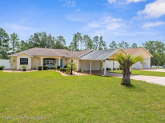 3/2/2 Home nestled on a DOUBLE LOT + Detached Garage (32x32) DOUBLE ENTRY DOORS in the highly desired Royal Highlands with NO HOA and NO FLOOD!! Built in 2007 and MOVE-IN READY, this METICULOUSLY MAINTAINED home offers 3 bedrooms + 2 bathrooms + 2 car attached garage + 2 car carport + LARGE detached garage (built in 2019) + fenced in yard with fire-pit + large covered screened-in back porch + charming front porch + DOUBLE LOT which is almost an acre total (.92 of an acre)!! ROOF on the home is brand new, Roof on the detached garage is 2019, NEW AC in May 2023, NO FLOOD!! NO HOA!! Bring your RV, camper, boat, ATVs, toys, pets...bring it all!! Zoned for the newest schools...Winding Waters (K-8) and Weeki Wachee High School!! High ceilings make this home feel light, bright, and spacious!! Upgraded kitchen with granite countertops, real wood cabinets, stainless steel double oven! Formal dining room! Kitchen is open to the breakfast nook and overlooks the private-feeling backyard! Glass sliders open up to an oversized, covered and screened-in back porch with outdoor living room, out door dining area, and a hot tub included adds an inviting amount of outside living space!! Split floor plan offers privacy for the master suite! Master has ensuite bathroom with dual sinks, real wood cabinets, walk-in shower, garden soaking tub, and large walk-in closet. Come see this incredible outdoor space!! What a large backyard! Completely fenced for your family and/or pets! Rock fire-pit for entertaining or enjoying the evenings outside, relax in the hammock, or enjoy gardening!! DETACHED GARAGE: The gem of the property, as nice as the house is, is the additional VERY LARGE detached garage that was built in 2019 (32x32) with concrete floor, wide and long concrete driveway for extra parking, electric, double automatic doors (each door is 10' high and 12' wide) and has a side entry door leading to the house/backyard and a workshop inside the garage. This gives you an incredible amount of garage space on the property with the 2-car attached garage and this large detached garage...so store your cars, boats, campers, UTVs, ATVs, or turn it into a large gym space, man cave, hobby area, work space...it has so much potential and so many uses!! This is not a metal garage...this is a well-build BLOCK garage with high ceilings, high and wide bay doors!! DOUBLE LOT: The double lot gives you an envious amount of extra outdoor space on your property!! It offers almost an acre of completely fenced land with brick paver sidewalk, large beautiful shade oak trees, storage shed for extra storage, fire-pit, and a garden area! LOCATION: Located in Royal Highlands! Close to rivers and springs for kayaking and swimming with the manatees, dinning on the river, grocery shopping! 1 hour north of Tampa Bay with easy access to Tampa International on the Suncoast Expressway!! Come see it today!