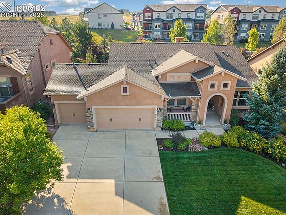 HIGHLY POPULAR FLYING HORSE BEAUTY! Previous Classic Homes Granby II Model Home. Ranch style with fully finished basement is cozy, but spacious, beautifully decorated, custom window coverings throughout. All appliances, including washer and dryer. Step in to this spacious, warm and comfortable floor plan. 5th bedroom on main makes a perfect office space. Lots of natural light adorned with custom drapes, shades and blinds. Basement includes a fully equipped wet bar and pool table. Perfect space for entertaining guests and overnight stays. Newer furnace, light fixtures. Fully landscaped yard and lots of room on patio for entertaining and relaxing. Furniture may be included and is Ready to move into. Close to AFA, shopping, schools, restaurants, easy access to I-25.