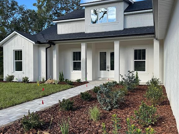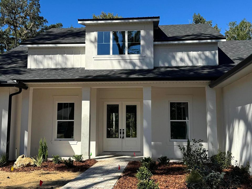 Driving up to a modern farmhouse complete vertical board & batten, metal roof accent, functional dormer, 1/2 light front doors, and pavers, what is not to fall in LOVE with.