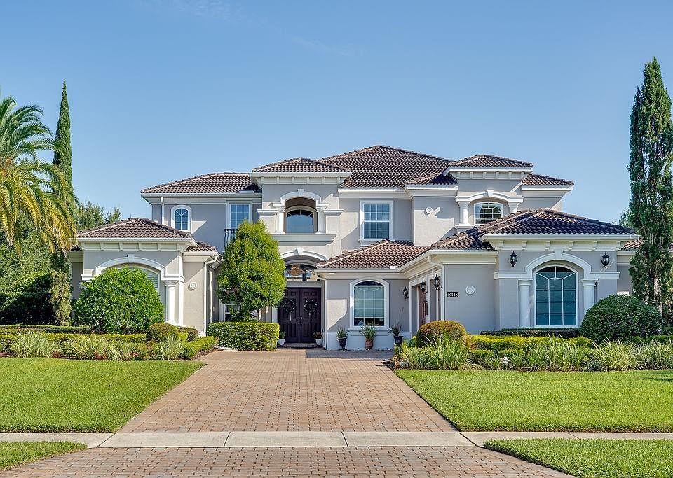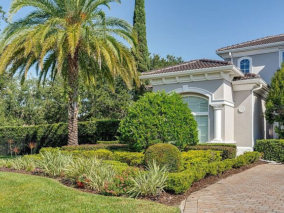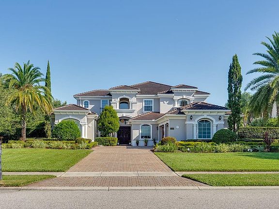 This exceptional Florida residence is perfectly sited on an acre within the exclusive guard-gated community of Bellaria. Thoughtfully designed to balance sophistication with comfort, the home welcomes you with an abundance of natural light streaming through broad front windows, highlighting the elegant handcrafted staircase in the foyer. The formal living and dining areas set the tone for refined entertaining, enhanced by a gas fireplace, a well-appointed wet bar, and expansive views of the sparkling pool and two-story covered porch. Just off the entry, the study provides an intimate retreat with porcelain flooring and clerestory windows, filling the space with natural light and framing serene outdoor vistas. The open-concept family room and kitchen create the heart of the home, where a wall of glass doors seamlessly blends indoor and outdoor living. The gourmet kitchen is a chef’s delight, featuring stainless steel appliances, exotic granite, custom cabinetry, tile flooring, and a spacious walk-in pantry. The first-floor master suite, thoughtfully tucked away for privacy, serves as a true sanctuary. Its spa-inspired bath is adorned with paneled cabinetry, exotic granite, a rainforest shower, soaking tub, and expansive closet areas—both beautiful and functional. Two additional en suite guest bedrooms, a versatile bonus room, and generous living and dining spaces make the main level ideal for everyday living or hosting. Upstairs, the thoughtful layout continues with three bedrooms, a loft, a sitting area, a bonus room, and even a second laundry room for added convenience. These flexible spaces adapt easily to the needs of a growing family or guests, offering opportunities for work, play, or relaxation. Blending elegance with livability, this home captures the essence of Florida living—where interiors open gracefully to resort-style outdoor spaces, making it perfect for both intimate family life and grand entertaining.