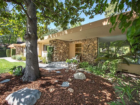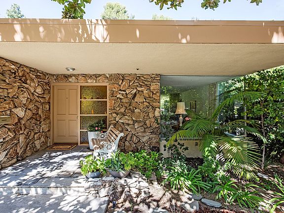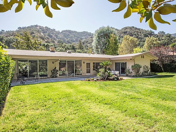 This popular, single story mid-Century home was built in 1962 and the current family bought it just 10 years later! It is a rare opportunity to own a mostly original mid-century that was built with all of the bells and whistles of the era. Sturdy construction, angled rooms, a dramatic corner glass window in the spacious step-down living room and large sliding glass doors that open to a oversized covered patio and enormous grassy yard beyond. All rooms have either great views of the surrounding mountains or the rear gardens, which may be extended with a relocated short retaining wall to allow room for a huge pool while maintaining an huge grassy area. The surrounding verdant hills makes you want to relax in your backyard and not leave home! In addition to the three bedrooms, there is