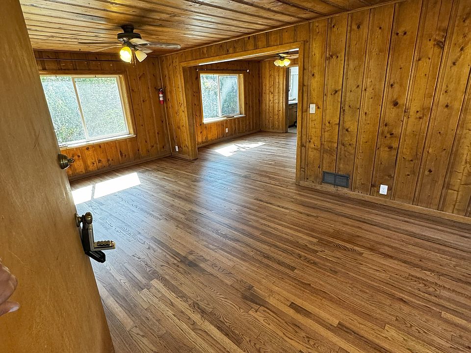 Inside, you'll find a spacious living area with a kitchen overlooking an open dining area and a cozy family room all on the main floor (WOOD floors refinished 2025, not if photos). 2 Bedrooms and a full bathroom are located at the back for privacy.