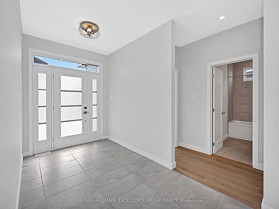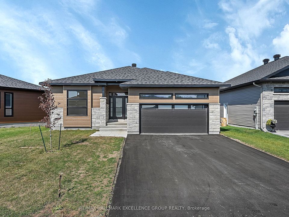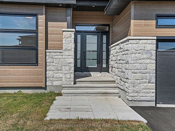 Brand-new contemporary bungalow offering elegant design and modern comfort! This stunning 1,862 sq ft home features a timeless stone façade, a double garage with access to inside, and an inviting layout perfect for todays lifestyle. Step inside to a spacious foyer with a walk-in closet, leading to an impressive open-concept living space that blends the kitchen, dining, and living areas seamlessly ideal for entertaining and everyday living. The gourmet kitchen boasts quartz countertops, a pantry, backsplash, quality cabinetry with pull-out drawers, and a functional island with built-in recycling station. Enjoy easy access from the dining and living areas to the exterior deck overlooking a deep backyard, perfect for summer gatherings. The primary bedroom offers a peaceful retreat with a luxurious ensuite featuring a soaker tub, walk-in glass shower, double vanity, and walk-in closet. Two additional bedrooms provide ample space with generous closets. A secondary side entrance conveniently connects to both the main floor hallway and the unfinished basement, which is roughed-in for a full in-law suite offering future income potential or multi-generational living flexibility. Additional features include ceramic & wide plank hardwood flooring throughout, 200 amp electrical panel, and immediate possession available. 24 Hours Irrevocable on all offers. Some photos virtually staged.