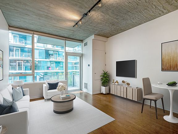 Generously sized balconyContemporary florence cabinetsExpansive windowsOpen-concept layoutQuartz countertopsStainless steel appliancesNew pendant light fixture