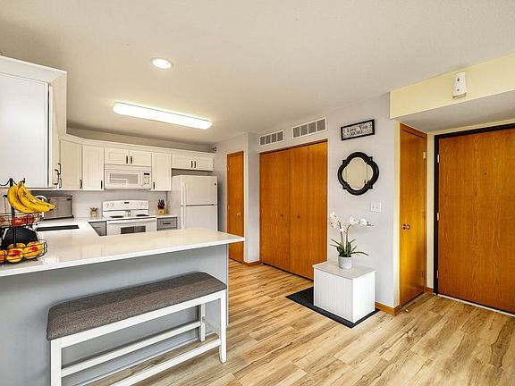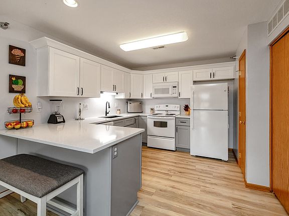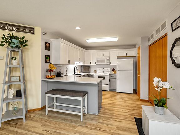 WHY RENT when you can own for less?  Get inside this completely updated 2 bed, 1 bath ground floor condo located in the heart of Grimes.  Bright and spacious living room with gas fireplace and private covered patio overlooking small green/nature area.  Updated kitchen with soft-close cabinets, soft-close drawers, new sink, new light fixture, and new countertops.  2 large bedrooms with plenty of storage to fit the largest of wardrobes.  New flooring throughout.  The bathroom has new flooring, a showerhead & faucet.  ALL appliances including washer and dryer are included.  The building has a secure entry with a keypad entry.  One car detached garage with garage door opener and keypad in place. LOW HOA dues take care of everything outside the front door - snow, lawn, trash, exterior maintenance, sidewalks, and driveways.  Pet restriction - 1 dog weighing 35 pounds or less or 2 cats.  NO rentals.  The unit has "aging in place" with larger 36" doors to accommodate wheelchairs/walkers and has zero entry from the parking lot.