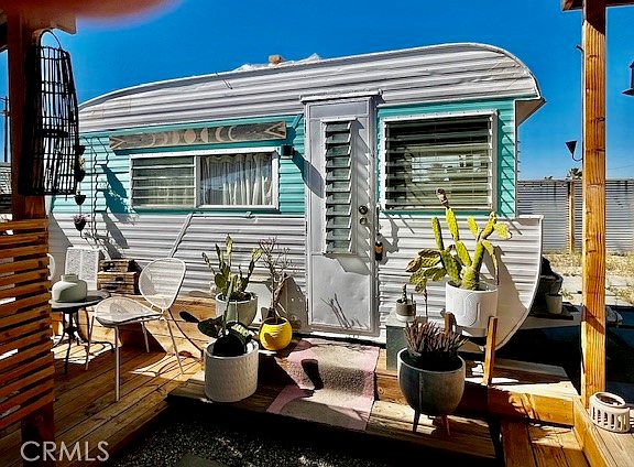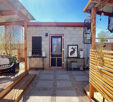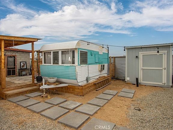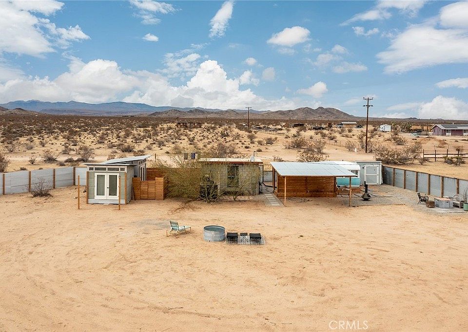 Jackalope Lodge – An Artist’s Retreat. We meet again - shortly before Joshua Tree blew up, when this property first came on the market, it quickly sold as a result of its distinct character – present owner now has to relocate and the opportunity to own this one-of-a-kind retreat arises again – with additional upgrades and even better with more living space. Unique in every aspect, this original tiny house – first built in 1957 as a Season Vacation Cabin, includes Working Water Meter and NEW 200AMP SCE Electrical Panel for all active utilities and even a flushing toilet and shower! (Zoned Rec Cabin, not SFR – but can be converted to SFR. Please note: CASH ONLY = NO LOAN, No Seller Carry – cash only means $.) For the entrepreneurial minded, 5-acre parcel can be split into two 2.5-acre parcels – buyer to check – on which you could build a SFR & ADU on each for a total of 4 livable units if you were to split the lot. Present configuration includes a working bathroom. Washer & dryer in shed! Brand new stainless appliances and cabinets in the kitchen, air conditioning in the living area; camper also has an air conditioner/heater combo. Outdoor shower and tub, along with a new 16’ diameter above-ground swimming pool, never taken out of the box. Trailer to chill or work in. Container room hang. Smartly designed and executed, this mini-resort/retreat has everything covered in a succinct, efficient way. Committed artists or idealists only, please. Get your dream on