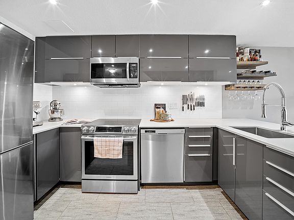 Modern designSleek kitchenHardwood inlaysWood-burning fireplaceTranquil north-facing patiosCity and mountain viewsQuiet greenbelt side