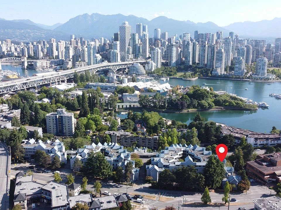 Welcome to Granville Island Village! This rare and unique 2 bed, 2 full bath concrete corner townhouse offers nearly 1,000 sq.ft. of living space. Freshly painted and move-in ready, it features many upgrades: new bedroom carpets, renovated ensuite and new washer & dryer. A defined foyer and hallway create a true home like entry, while the smart layout separates bedrooms from the main living area. The large living/dining area easily accommodates full-size furniture, and the efficient kitchen with ample counter space connects seamlessly to the entertaining area. The patio opens onto a quiet grass common area, ideal for relaxing or gardening. With the roof and rainscreen recently renewed and fully paid, this home offers worry-free ownership for decades ahead.