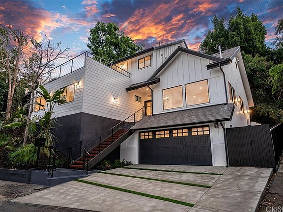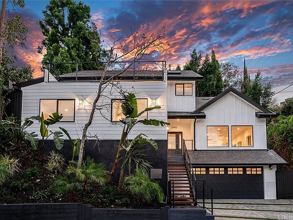 Enjoy gorgeous views from this stunning modern farmhouse set atop the hills of prime Sherman Oaks. This re-imagined home has been completely remodeled with beautiful designer finishes sparing no expense. Featuring 3 br + 2 full baths & two ½ baths, approx. 2,864 sq. ft., open floor plan , sun-drenched rooms, high ceilings and direct access from the garage. Enjoy cooking in the chefs kitchen w/ top of the line Thermador appliances, custom cabinetry, walk in pantry, & breakfast bar opening to the dining room & living room. Two bedrooms, full bath and a powder room complete the first floor. Ascend to the family room which is flooded with natural sunlight and includes an office area with beverage bar looking out to the backyard. The French doors open up to a serene private backyard with large pool & hot tub surrounded by mature trees. Perfect for indoor - outdoor entertaining. Retreat to your spacious master suite with vaulted ceilings, large walk- in closet, spa-like bath with oversized shower, & dual sink vanity. Enjoy the views of the valley from your large viewing deck directly off the master suite. Other features include: exercise room, large laundry room, wide plank white Oak hardwood floors, skylights, new central heat/air, security cameras, surround sound ceiling & exterior speakers, and is pre-wired for a smart system. A must see!