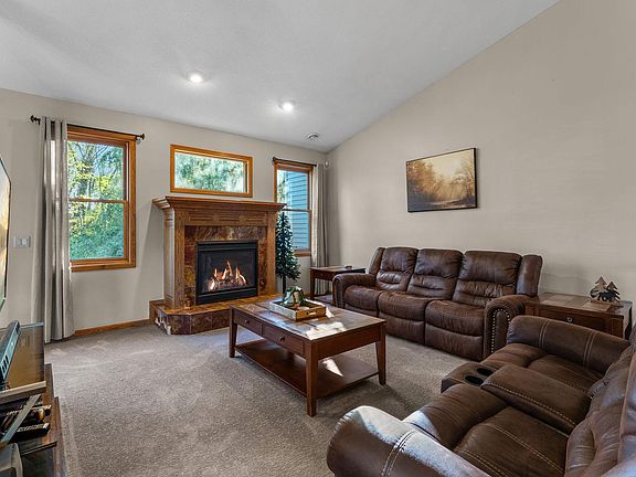 The heart of this home is the expansive kitchen, complete with a walk-in pantry and generous counter space, leading to an oversized dining area ideal for memorable family meals. The living room is anchored by a gas fireplace, complementing the home's in-floor heat for those cozy Minnesota evenings. Vaulted ceilings and custom woodwork throughout the house add to the charm and warmth of this spacious home.