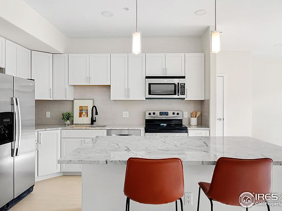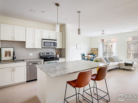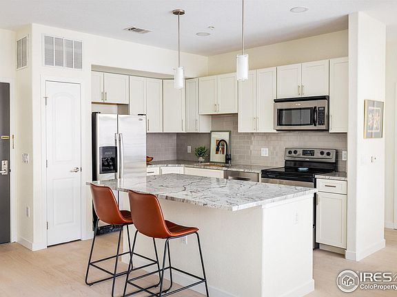 The most stunning condo to hit the market in Vantage Pointe Lofts! Flooded with natural light and redesigned for seamless open-concept flow, this fully remodeled residence is a rare find. The airy, expansive feel is luxuriously inviting. This prime location offers unbeatable convenience, just 15 minutes to Boulder and 20 to Denver, with Flatiron Flyer and RTD airport transit a short walk from your door. Outdoor lovers will appreciate easy access to Glacier Park, Cradleboard Trail, and open space trails, seamlessly connecting to Rock Creek and Boulder County trail systems. Step inside to discover a contemporary oasis where high-end finishes and modern design converge. Spoil yourself with the stylish kitchen featuring sleek, high-quality cabinetry and granite slab counters, tile backsplash, deep sink with prep area, stainless steel appliances, expanded center island with seating, and chic pendants. The living and dining areas blend effortlessly with hardwood floors and recessed lighting, opening to a private balcony ideal for morning coffee or evening relaxation. Living comfort throughout the home is enhanced with two contemporary ceiling fans allowing you to control air seasonally. The spacious bedroom, with new carpet and double closets, includes an en-suite bath with a walk-in shower and soaking tub. A conveniently located half bath near the kitchen adds functionality. This unit includes a reserved underground parking space right next to the elevator for effortless access. A large locker offers easy storage, and shared Level 2 EV chargers are available on-site. Just steps away, the community center enhances the lifestyle with a fitness center, outdoor pool, two year-round hot tubs, a fire pit, BBQ area, and clubhouse with a kitchen, pool table, and ample gathering space. Whether commuting to Boulder, jet-setting from DIA, or seeking a stylish, move-in-ready home, this exceptional condo delivers it all!