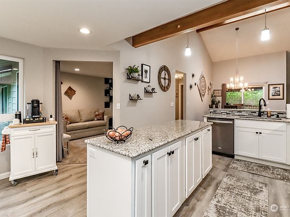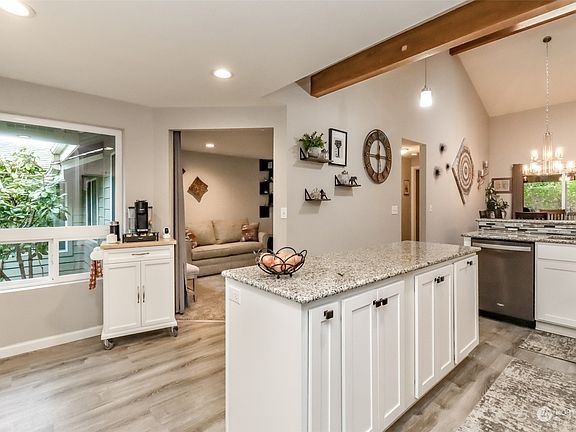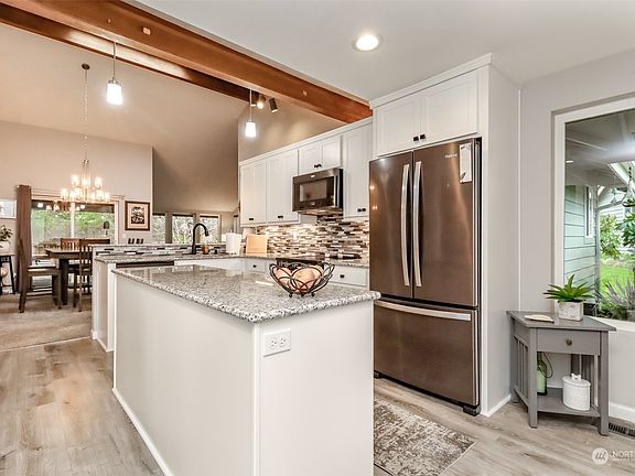 What a remarkable find.This one-story condo has been beautifully remodeled. It is open and flowing, saturated with natural lighting. Granite countertops, island, eat-in kitchen area, new light fixtures, skylights and vaulted ceilings, wood fireplace, garden window in sunroom/office that overlooks the beautiful greenbelt and private park-like area. Fenced backyard. Covered deck, firepit, bamboo planters, raised garden beds. Two-car garage. Only 1 step to get inside the house. There is also a den that could be a 3rd bedroom. Airconditioning. Extra storage in garage, new paint inside, new carpet. In the UP school district.Only 38 homes in this highly sought-after community of Valley Firs.The HOA maintains the lawn.Close to Fircrest Golf Course
