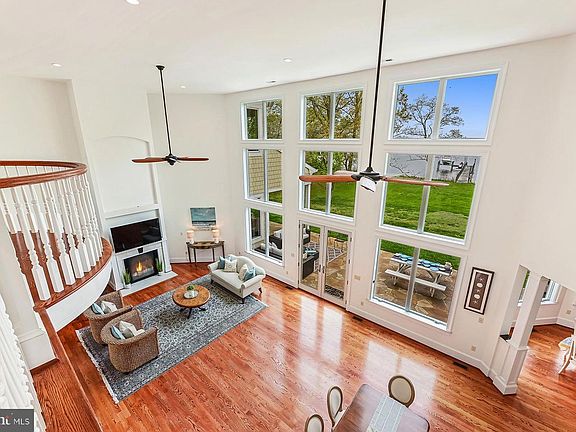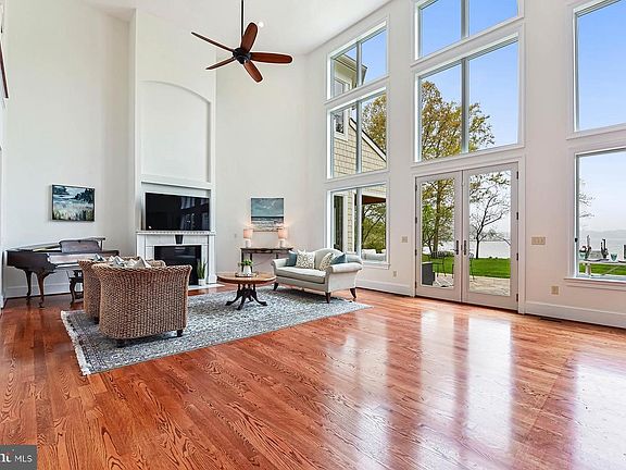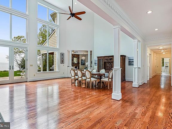 The second floor has four bedrooms with ensuite bathrooms, a bonus room, and an elevator servicing all three levels. The third floor has two more bedrooms, a bathroom, and a casual seating area—ideal for guests or as an au pair suite. The oversized four-car garage includes space for a boat or RV. Outside, a large terrace leads to the private beach and pier. The property is equipped with geothermal heating and cooling, multiple hot water heaters, and two backup generators. Just an hour from Washington DC and 40 minutes from Annapolis, this is an unparalleled waterfront retreat.