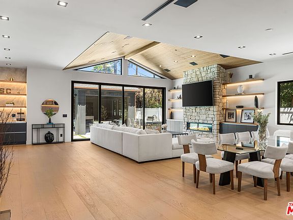 This fully renovated 5BR/4.5BA single-story home in coveted Chandler Estates offers 3,600 sq ft of refined living space on a prime corner lot. The open floor plan features a chef's kitchen with custom cabinetry, high-end appliances, and a large center island. A spacious dining area with wet bar and a dramatic family room with vaulted wood ceilings and stone fireplace create a warm, elegant atmosphere.Seamless indoor-outdoor flow leads to a private backyard oasis with a cabana, fireplace, pool/spa with waterfall, and built-in BBQperfect for entertaining. The luxurious primary suite includes vaulted ceilings, stone fireplace, walk-in closet, and spa-inspired bath.Custom finishes, smart home technology, surround sound, and a full security system complete this exceptional offering in one of Sherman Oaks' most desirable neighborhoods.