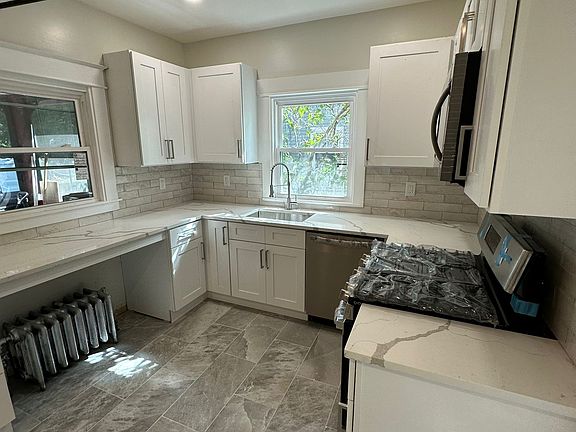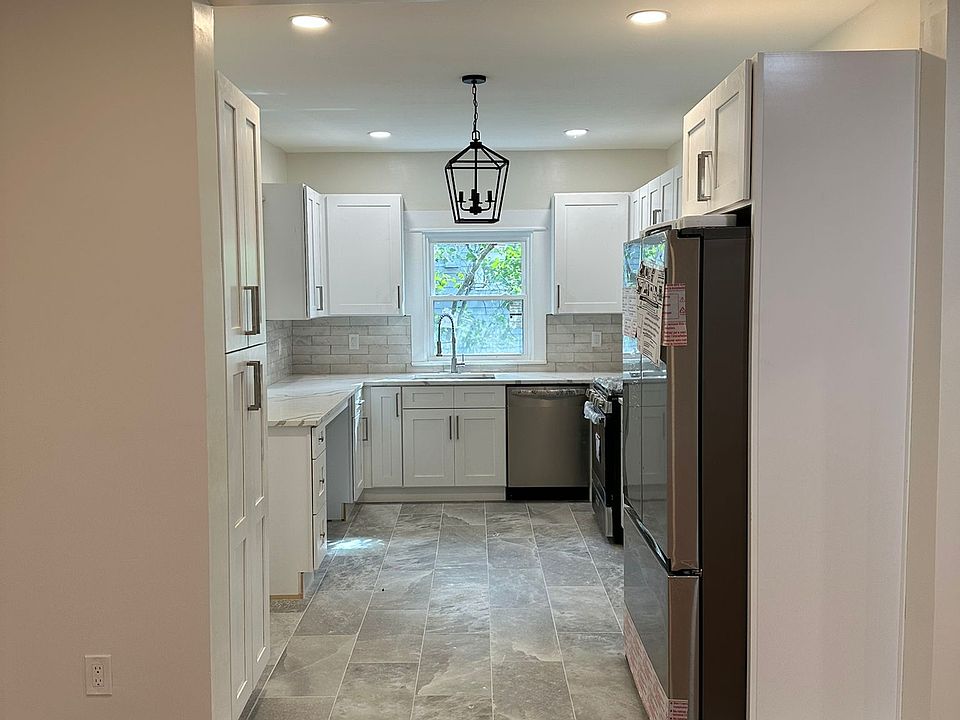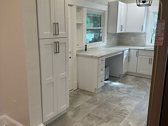 White shaker cabinets, subway tile backsplash, and stone tile flooring