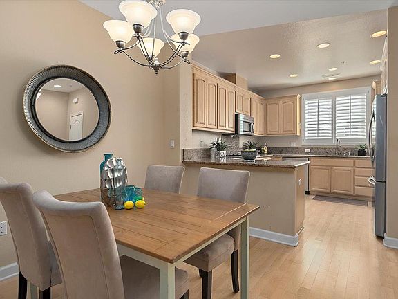 This townhouse stands firm, built in 2004, made to last. The home is fresh, the floors clean, the air inside still and waiting. Light comes through the high windows and spills across the wood floors, stretching long in the morning and slanting low in the evening. The kitchen has quiet maple cabinets, tan stone counters, and stainless steel KitchenAid appliances that catch the light. The adjacent dining area is perfect for hurried breakfasts or slow suppers. The living room has a gas fireplace where warm nights settle like an old friend.