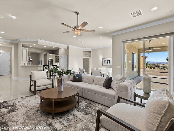 Welcome to 1348 Basin View, a stunning home in the prestigious Prominence subdivision of Sun City Mesquite. With over 2,400 sq ft of refined living space, this 3-bed, 2.5-bath residence blends elegance with modern comfort. The open floor plan features seamless porcelain tile, custom lighting, crown molding, and warm neutral tones for a sophisticated yet inviting feel. Set on a .25-acre elevated lot, enjoy breathtaking tri-state mountain views—an ideal backdrop for both relaxation and entertaining. Thoughtfully designed for luxurious, versatile living, every detail adds to the home's upscale appeal. Don’t miss your chance to experience exceptional desert living. Schedule your private tour today!