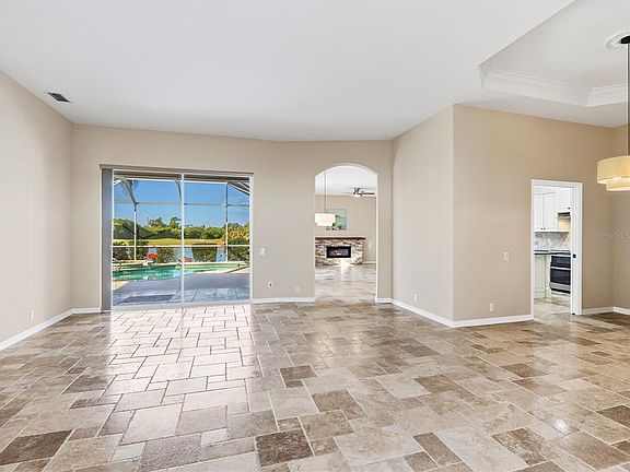 Enjoy tranquil lake views from this beautifully updated 3-BEDROOM PLUS DEN home in the desirable Pelican Pointe Golf & Country Club. Elegant TRAVERTINE TILE floors, NEW bedroom carpeting, PLANTATION SHUTTERS, and stylish NEW LIGHT FIXTURES AND FANS create a warm, inviting ambiance. The spacious kitchen features quartz countertops, stainless-steel appliances, and a LARGE PREP ISLAND WITH BUILT-IN MICROWAVE AND WINE COOLER, ideal for entertaining. Relax in the family room with BUILT-IN ELECTRIC FIREPLACE or retreat to the luxurious primary suite with HUGE CUSTOMIZED WALK-IN CLOSET, soaking tub, shower, and private WC. A split floor plan provides privacy with a 2-BEDROOM GUEST SUITE that can be closed off with a pocket door. Enjoy serene outdoor living on the lanai with a RESURFACED HEATED POOL AND SPA, framed by swaying palms and lake views. Additional features include a 2020 ROOF, ACCORDION HURRICANE SHUTTERS, and impressive CURB APPEAL. Your social membership includes access to a vibrant clubhouse with restaurant and bar, fitness center, tennis, pickleball, heated lap pool, and a premier 27-hole championship golf course. With modest HOA fees covering lawn care, cable, internet, and security, this home offers a CAREFREE, RESORT-STYLE LIFESTYLE just minutes from downtown Venice, Gulf beaches, shopping, and dining.