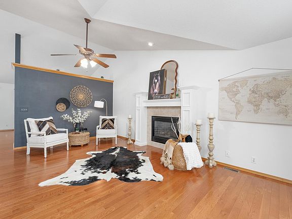 Cozy luxury with golf course and pond views! Tucked along the fairway with tranquil pond views, this beautifully updated 4-bedroom, 3 bath home blends warmth, comfort and elevated style. The outdoor spaces are a true retreat. Relax on the spacious, maintenance-free deck or unwind on the partially enclosed walkout area at basement level, complete with hot tub, gas fire pit and outdoor furniture that stays with the home. The professionally landscaped yard is framed with elegant wrought iron fencing, offering both beauty and privacy. Step inside to a welcoming open layout filled with natural light. Fresh paint and updated lighting complement rich hardwood floors that run throughout the living room, kitchen and hallway. The living room features vaulted ceilings and a cozy gas fireplace. The kitchen is a chefs delight with granite countertops, gas range, stainless steel appliances including refrigerator, dishwasher, and disposal – all with a stunning view of the pond and golf course right outside your window. The spacious primary suite feels like a private escape with coffered, decorative stamped ceilings, a generous walk-in closet, and a fully updated bathroom. Downstairs, the walkout basement offers a large rec room with a second fireplace, a full wet bar with mini fridge, and plenty of space to entertain. The basement also features one finished bedroom, one bath and one unfinished room with a hydraulic egress which offers flexibility for another bedroom, hobby room, or an exercise room – the possibilities are endless. Additional features include an oversized 3 car garage with built-in cabinets, shelving and pegboard, a class IV impact resistant room (2019), gutter guards, Trane HVAC (6 years old), and a sprinkler system fed by well water. Located in a peaceful neighborhood with low HOA fees and access to 4 community pools, plus NO SPECIALS! Don’t miss your chance to experience this rare blend of comfort, elegance, and breathtaking views. Schedule your private showing today!