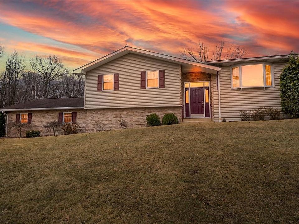Nestled atop a picturesque hill in the serene countryside of West Penn Township, this beautiful home features 3 bedrooms and spans 4 acres across two parcels, offering a perfect blend of privacy and natural beauty along with a spacious two-car garage. The main level boasts stunning hardwood floors that create a warm and inviting atmosphere throughout the home. The kitchen is equipped with stainless steel appliances, including over-the-range microwave and breakfast bar making it a great space for both cooking and gathering. Additionally, the modern bathroom is adorned with tile flooring, backsplash & wainscotting. Just off the kitchen, a heated sunroom invites you to relax with your morning coffee while enjoying views of the expansive backyard. The living room, with its charming bay window, floods the space with natural light. On the lower level you'll find a versatile space that includes a built-in-desk and cabinets, perfect for an ideal workspace. There's also a half bath and an additional room that could serve as a family room or a hobby space, along with a laundry closet. Step outside to discover beautifully landscaped grounds, featuring two separate patios, ideal for summer evenings spent entertaining or unwinding under the stars. The property is adorned with fruit trees, adding a touch of sweetness to your outdoor experience. Bonus features include central air (2017), h/w heater (2025), generator hookup & security system.Minutes to downtown Tamaqua to local amenities.
