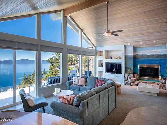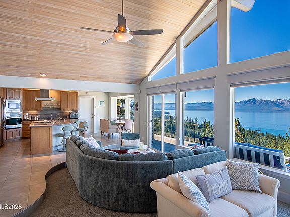 Unfiltered, panoramic, million-dollar lake views of Lake Tahoe a vantage point so commanding it stands among the most breathtaking of any Nevada property on the market today. Set high above the shoreline in the exclusive enclave of Cave Rock Estates, this sophisticated mountain retreat blends timeless architecture with modern elegance. Extensively remodeled in 2010, the home showcases exceptional craftsmanship, livability, and intentional design across over 3,400 square feet of living space on 0.42 acres. A level-entry floor plan opens to a dramatic great room crowned with vaulted wood-beam ceilings and a floor-to-ceiling glass wall that frames the lake in full panorama. The open layout flows effortlessly between living, dining, and kitchen zones ideal for refined entertaining or intimate evenings by the stone gas fireplace. Three sliding glass doors extend the space to an expansive glass-railed balcony, where southwest exposure captures Tahoe's golden sunsets, Mt. Tallac, and the East Shore's glittering horizon. A convenient powder bath completes this level. The chef's kitchen is both functional and artistic, showcasing rare blue granite countertops, custom cabinetry, and premium appliances. A striking Emerald Bay mural adorns the fireplace wall, a bespoke tribute to one of Tahoe's most iconic vistas. The lower level reveals a richly appointed family room with wet bar, a dedicated office, and a guest bath designed as a private spa with an oversized jetted soaking tub. The primary suite spans the lake-facing façade with wall-to-wall glass, dual walk-in closets, and a luxurious ensuite bath featuring a double steam shower for six, dual sinks, and a two-person jetted spa tub. A laundry room completes this level. On the lowest level, two additional bedrooms and a full bath continue the home's theme of unbroken lake vistas and thoughtful layout, each opening to a private view balcony. In total, the residence offers three expansive balconies — one on each level — providing multiple vantage points to enjoy the lake's ever-changing moods. Modern enhancements include lifetime metal siding, composition roof, a solar panels with Tesla Powerwall battery storage, and a two-car garage. Perfectly positioned just minutes from Nevada's pristine East Shore beaches, this home embodies the seamless balance of modern luxury and mountain tranquility. This is more than a home — it's an experience in contemporary mountain luxury, sustainable innovation, and 180° panoramic perfection that defines the essence of Lake Tahoe living.