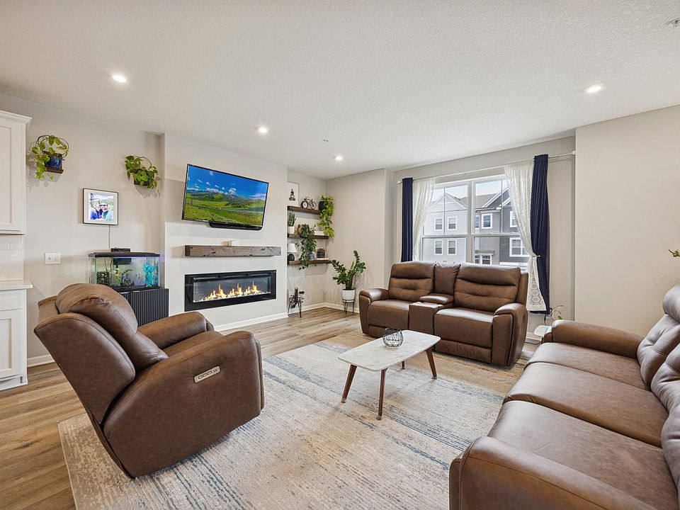 This three-bedroom, three-bathroom house offers approximately 1,924 square feet of living space. The home features a fireplace, providing a cozy and inviting atmosphere, especially during the colder months. The primary bedroom boasts an upgraded closet, offering ample storage space. The deck provides an outdoor living area, allowing residents to enjoy the pleasant weather and the surrounding environment. The hardwood floors throughout the home add warmth and character, complementing the open floor plan design. Additional storage areas are available, providing convenient space for personal belongings. The property is situated in close proximity to the Elm Creek Park Reserve, offering residents access to nature and recreational opportunities.