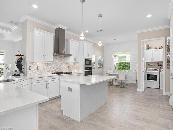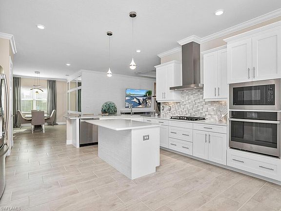 HUGE PRICE IMPROVEMENT! FURNISHED! STUNNING LAKE VIEWS! Welcome to Vista WildBlue! BETTER THAN NEW! NOT IN A FLOOD ZONE! Looks and feels like a model that is loaded with upgrades and designed to impress the most discerning buyer. This beautiful Tivoli floorplan offers 2,271 sqft under air with 4 full bedrooms, 3 full bathrooms and a 3-CAR GARAGE! This gorgeous home is being sold designer FURNISHED! Custom finishes throughout with custom coffered ceilings in living room and primary suite, crown molding throughout, upgraded new lighting, chandeliers, faucets, hardware, wave tile, screened entryway, outlet covers, door handles, hinges, stoppers, towel racks and toilet paper holders. The oversized kitchen is a chef's delight with abundant cabinets and counterspace, natural gas, upgraded stainless-steel appliances, refrigerator has built-in Keurig coffee maker, quartz countertops, designer glass tile backsplash included in cooking, bar, and center island, above cabinet lighting and a cozy separate eat-in nook with custom wall mirror. The dining room is stunning with a beautiful chandelier and custom wall mirrors. The living room is open to dining room and kitchen areas with beautiful entertainment wall and built-in fireplace. The living area extends out to the beautiful outdoor covered lanai with new outdoor kitchen (never used), custom wave tile on walls, new tongue-and-groove ceiling with remote lighting behind crown molding and electric hurricane shutters for peace of mind. A beautiful sparking pool with spill over spa overlooks gorgeous lake views with upgraded lush tropical landscaping and outdoor lighting with spectacular evening sunsets. The primary suite is a luxurious retreat that includes new floor tile, wave tile, custom coffered ceiling, lighting and a large walk-in closet with beautiful views of the pool and lake. The primary bathroom has been redesigned by removing the tub for an oversized walk-in glass shower, double sinks, and private water closet. Split secondary bedrooms offer separation and privacy. The front bedroom is an ensuite perfect for guest with its own private bathroom and a new glass shower enclosure. The large 3-car garage has storage cabinets with lighting below and storage above the garage doors. This home has impact windows and doors, and flood insurance is not required. All pavers in the pool area and driveway have just been power washed and professionally sealed. WildBlue offers 5-star amenities, 800-acre lake, resort pool, lap pool, day spa, 6 har-tru tennis courts, 8 pickleball courts, full time tennis director, fitness center, boat launch w/day docks, playground, sport court, indoor fine dining and outside pool bar/grill. WildBlue is the perfect location between Naples & Ft Myers, minutes from Miromar Outlets, Gulf Coast Town Center Mall, Hertz Arena, SWFL Intl Airport, schools, shopping, restaurants and close to beautiful beaches.