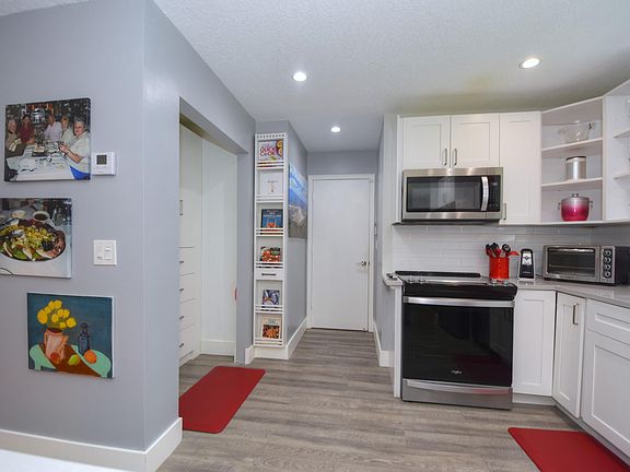 Extensively remodeled two bedroom/two bath villa home with den in 55+ community of Delray Villas. Corner lot with canal view; no homes behind for privacy. Skylights and granite counter tops in both bathrooms. Energy efficient high-hat lighting throughout. New roof in 2020. New A/C, hot water heater and washer in 2021. Following items all new since Feb. 2024: Waterproof gray vinyl plank flooring throughout. Remodeled kitchen including custom pantry, quartz counter tops, quartz sink, sensor faucet, garbage disposal, stove, microwave, refrigerator and beverage cooler. Impact windows throughout; double french impact doors to patio. Master bathroom updates including frame-less shower doors, mirror, light fixture, towel bars and toilet. Custom closets in master bedroom and guest bedroom. Power roller shades on master bedroom and hall closets. Plantation shutters throughout. Contemporary lighted ceiling fans in den, master bedroom and guest bedroom. SimpliSafe security system. Interior lever door handles throughout. Clothes dryer. Interior painted throughout. Extended concrete patio in rear with privacy hedge. Exterior light fixtures at front and rear entrances.