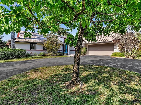 Drive through the gate and follow the tree-lined driveway to this uniquely stunning estate nestled on over 2 acres and set on one of the most coveted streets in Southwest Ranches. This home invites you in with its distinctive yet casual design and attention to detail. Fruit-bearing trees and lush foliage create an unparalleled backdrop for creating memories. Inside you will find 5 beds/3.5 baths plus 30x20 flex room, ideal for media, gym or recreational space. Vaulted ceilings with wood finishes add a unique touch and a multitude of glass sliders frame the picturesque outdoor views. Step outside to the spacious L-shaped covered patio and relax or entertain beside the inviting heated pool. Metal roof and gutters 2023, Complete home generator. 3 ACs, oversized 2 car-garage etc.