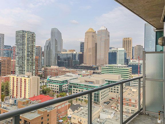 AIRBnB/short term rental friendly building! Perched on the 18th floor, this stylish 2-bedroom, 1-bathroom unit showcases spectacular downtown Calgary views through expansive floor-to-ceiling windows. The bright, open layout features polished concrete floors, in-suite laundry, and comes with a secured, heated parking stall in this solid concrete building. Enjoy a prime Beltline location with a 98/100 Walk Score and 94/100 Bike Score—just steps from some of Calgary's best restaurants, cafe's and shops. Right next door you'll find Vine Arts, Proof Cocktail Lounge, Anytime Fitness and First Street Market. Building amenities include a 4th-floor terrace garden and convenient bike storage. This is inner-city living at its finest—whether as a home or investment!
