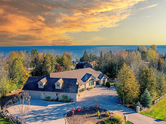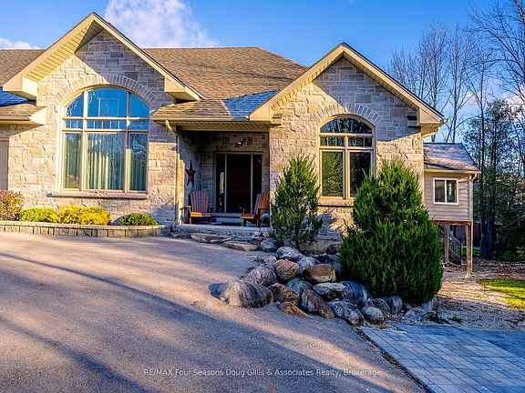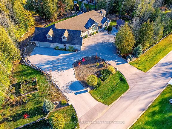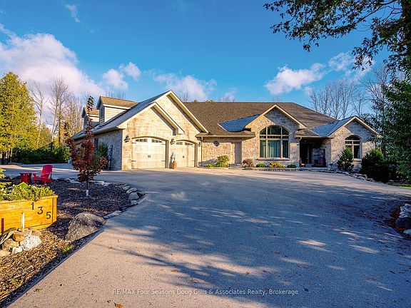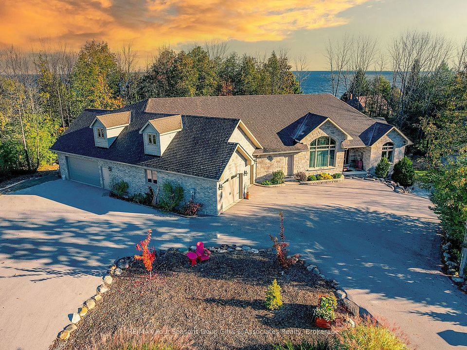 This stunning 4,588 sqft custom-built home is perfectly situated on a quiet 0.89-acre(+/-) cul-de-sac in one of Meaford's most desirable neighborhoods. Designed for comfort, style, and functionality, this 5-bedroom, 3.5-bath residence combines timeless curb appeal with thoughtful interior details. The exterior features professional landscaping, split rail fencing, dual stone-pillared driveways, and a striking stone & brick façade with steep rooflines and large windows. Inside, the main floor offers 9' ceilings, wide hallways, oak hardwood and ceramic flooring, and vaulted ceilings with tongue-and-groove paneling in the open-concept living, dining, and kitchen areas. A gas fireplace with custom oak built-ins provides a cozy focal point. The chef's kitchen includes custom off-white cabinetry, granite countertops, dual stone sinks, a central island, tiled backsplash, and stainless-trim appliances, including a gas range, hood, fridge with ice-maker, and dishwasher. A cedar-lined 3-season sunroom adds charm and versatility, while the living room opens to a deck with panoramic Georgian Bay views. The lower level features a spacious rec room with walk-out access, providing flexible space for entertaining, recreation, or family living. Both garages are oversized, insulated, and drywalled - one with heated floors, the other with a unit heater - offering room for up to 4 vehicles, a workshop, or additional storage. The yard is fully equipped for outdoor living, including a vegetable garden and garden shelter. Additional features include main-floor laundry with front-load washer/dryer, natural gas furnace, central air, HRV system, dual hot water heaters, central vacuum, municipal water, and an Eco-Flow septic system serviced annually. Built by the owner to an exceptionally high standard with quality materials and craftsmanship, this home is ideal for families, investors, or anyone seeking upscale, peaceful living just minutes from Meaford's waterfront, golf, and amenities.